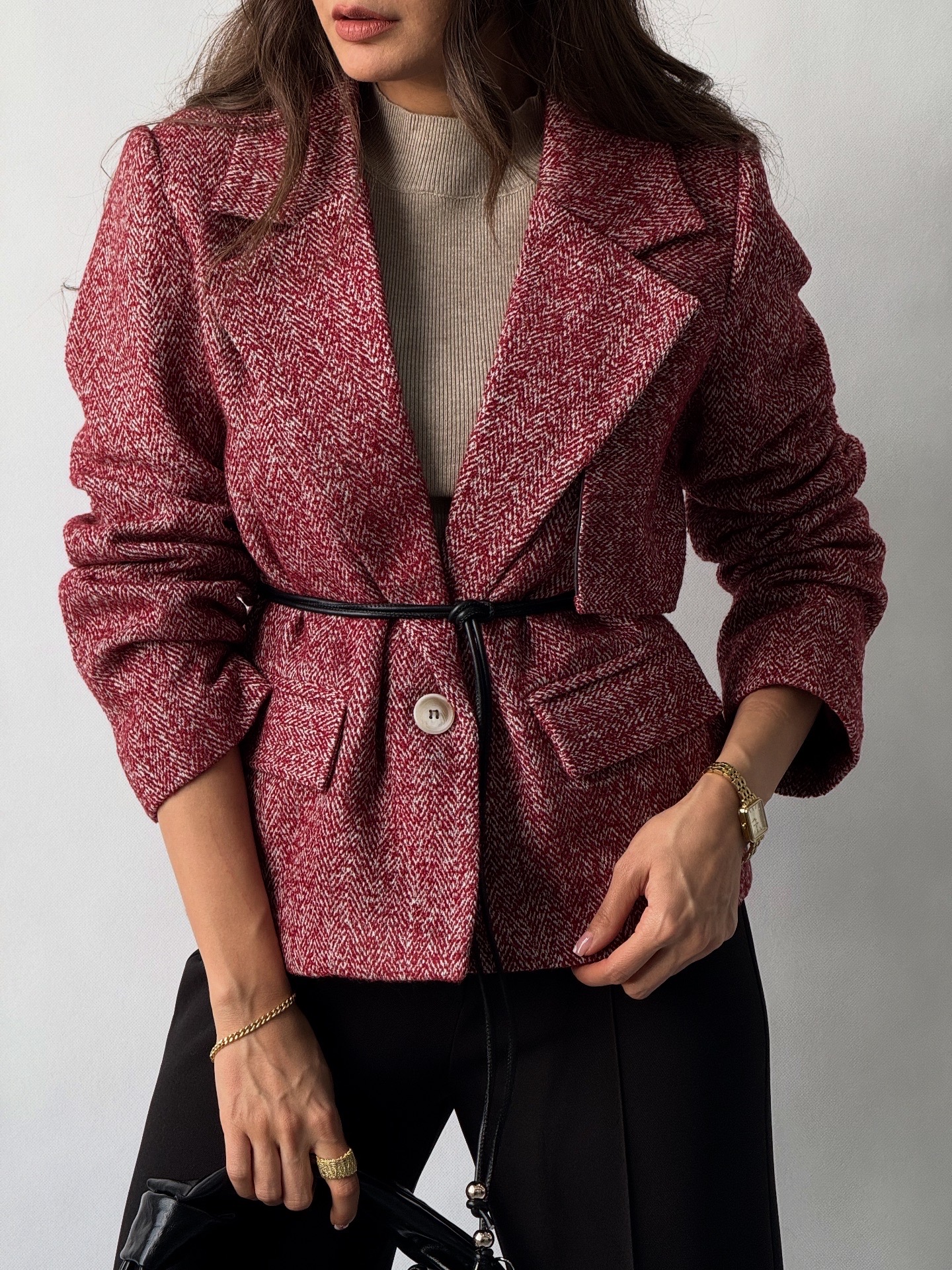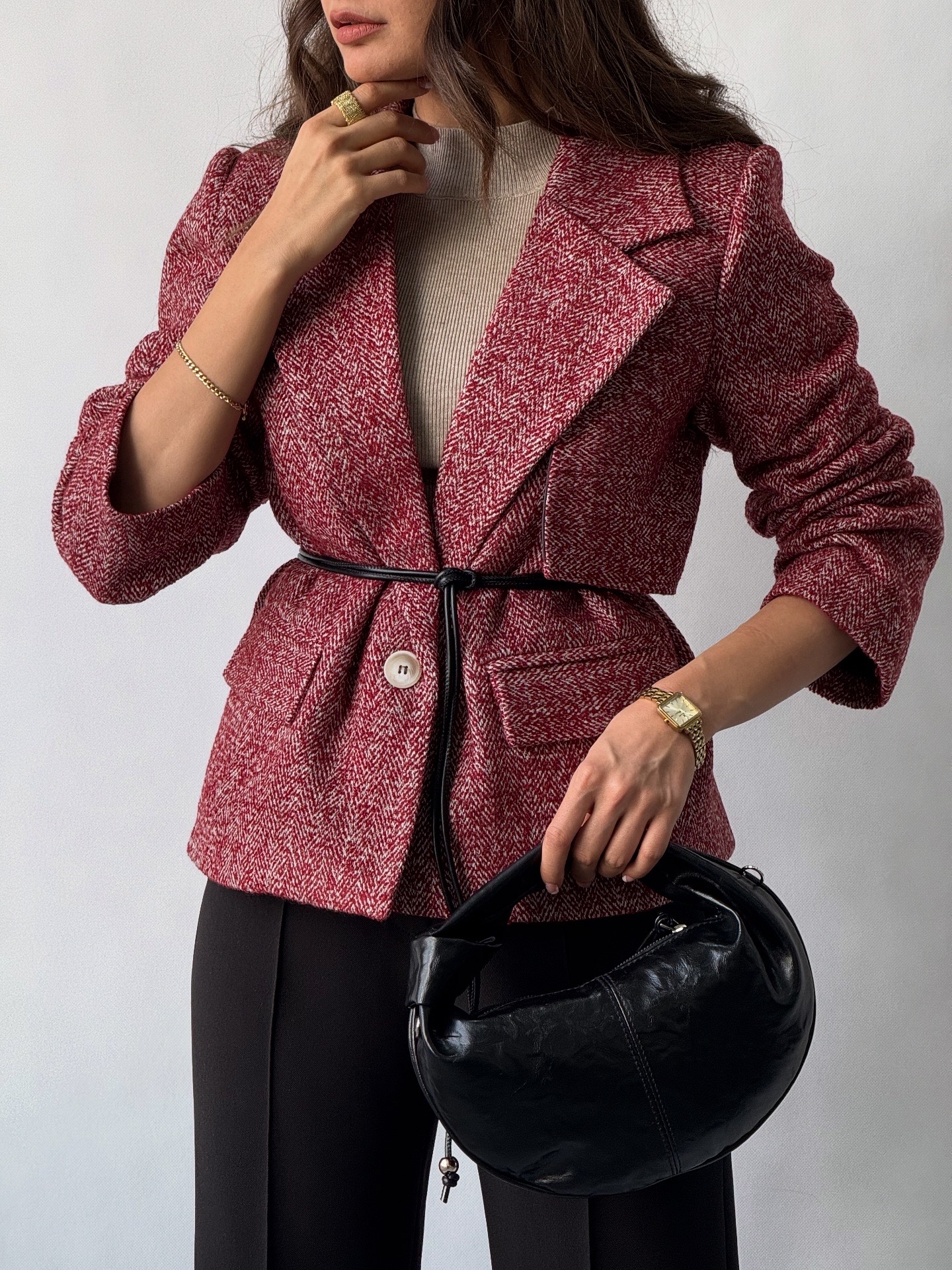 پارچهی ترک با بافت جناغی خاص و کمربند چرمی که فرم تنخور رو چشمگیرتر میکنه ✨